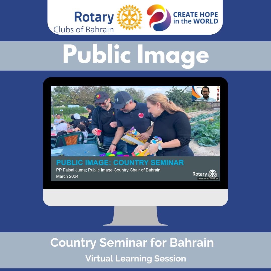 The Rotary Clubs of Bahrain organized a Public Image virtual seminar on a country level in Bahrain on Monday 25th of March 2024. The session was opened by DDG Amira Ismail and conducted by PP Faisal Juma, the Public Image Chair of Bahrain. The meeting was an interactive session discussing relevant topics such as the importance of public image, using social media and the People of Action campaign.