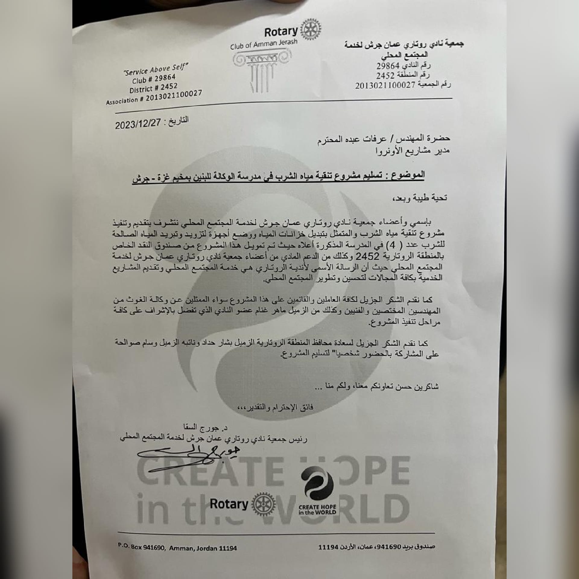 We emphasized to the school authorities the importance of ongoing maintenance to ensure the longevity of the system and to consistently monitor the water quality. The facility’s funding and sponsorship were made possible through a grant from Rotary District 2452, further bolstered by the generous contributions of members of the Rotary Club Amman Jerash. This initiative represents just one among many projects undertaken by the Rotary Club in the realms of health, education, environment, and water. The club is committed to investing in water, recognizing its fundamental role in sustaining life, and advocates for universal access to clean water, regardless of geographical location.